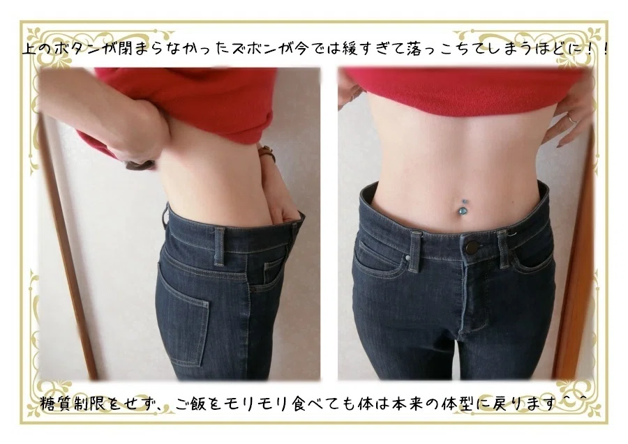 現在30代後半。なかなか落ちない体重に悩まされてましたが、みるみる体重が減り大人になって今が一番軽くなりました。お米を食べる量が増え、一食で男性用お茶碗いっぱいにご飯を食べますが、太りません。